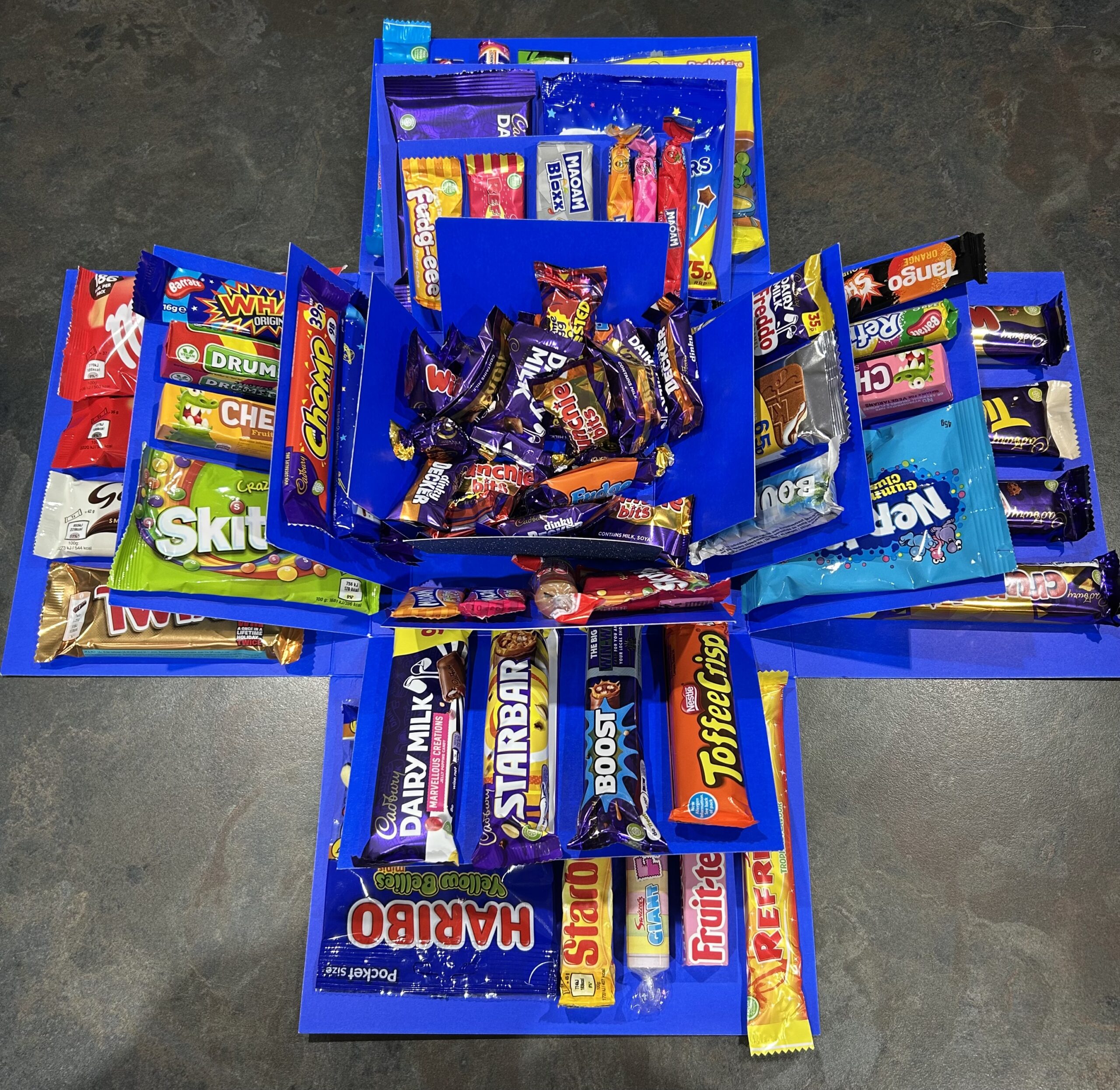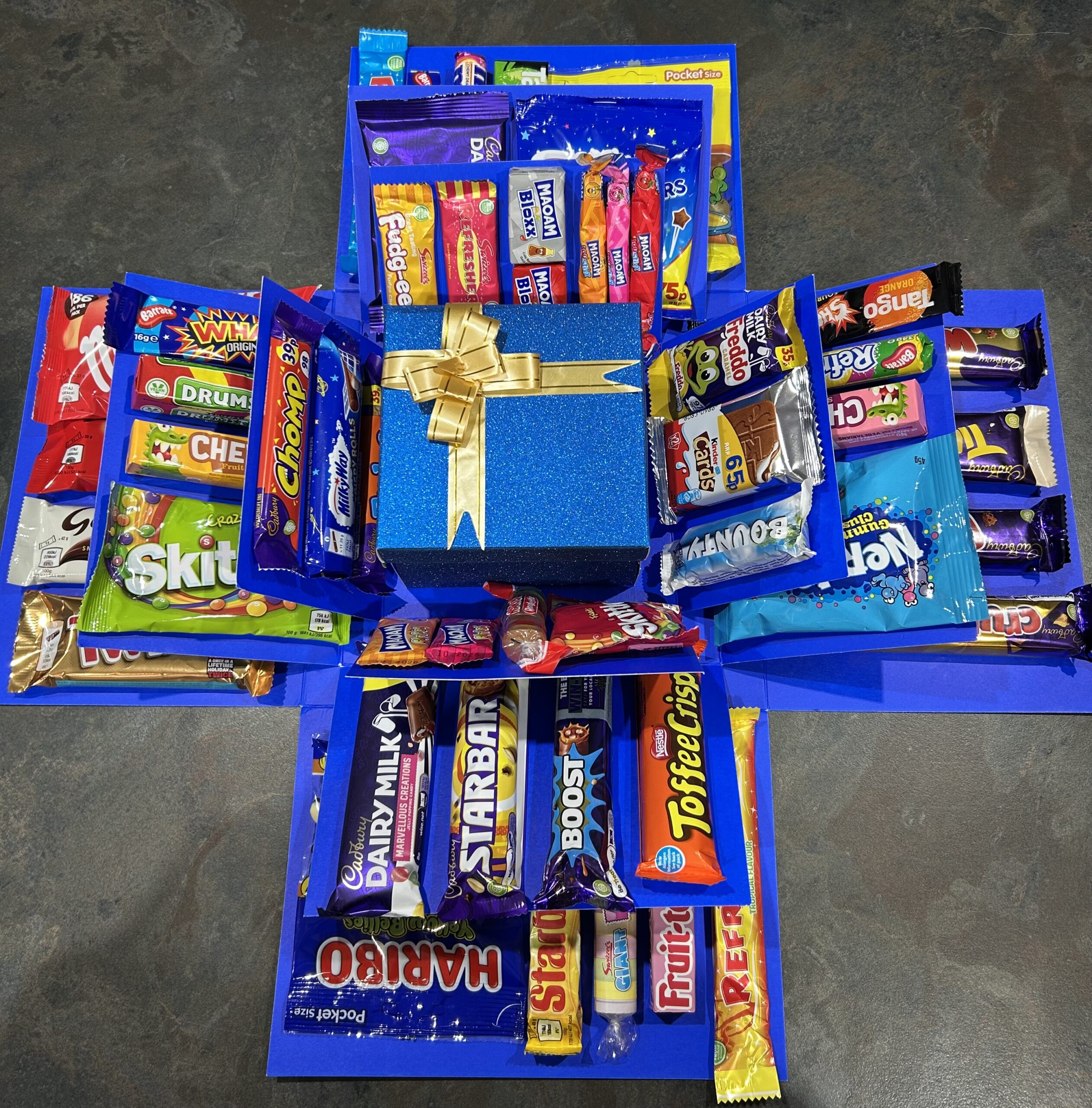 🎁 As you lift the lid, layers unfold to reveal a delicious explosion of everyone’s favourite chocolate bars and sweets — from Galaxy, Dairy Milk, Haribo, Millions and more! Each tier is carefully packed and beautifully presented for that magical “wow” moment.