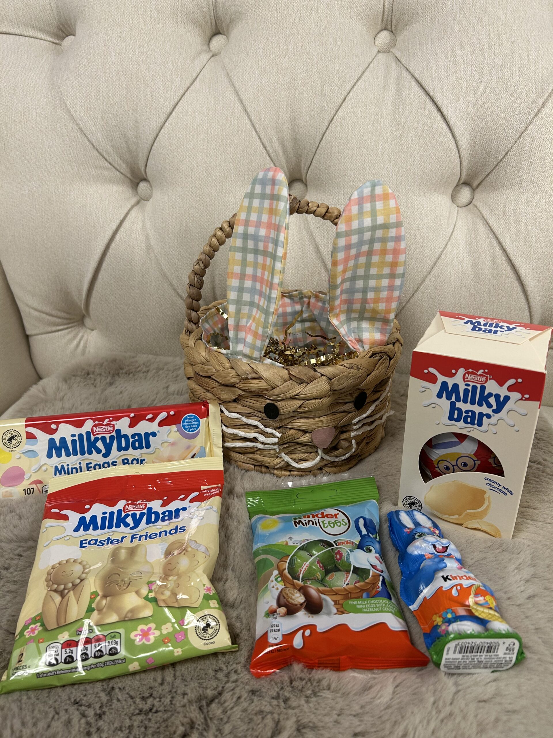 Nestled inside a charming bunny-faced wicker basket with soft pastel ears, your little one will discover a delightful mix of toddler-suitable chocolate treats — just the right size for small hands and big smiles.