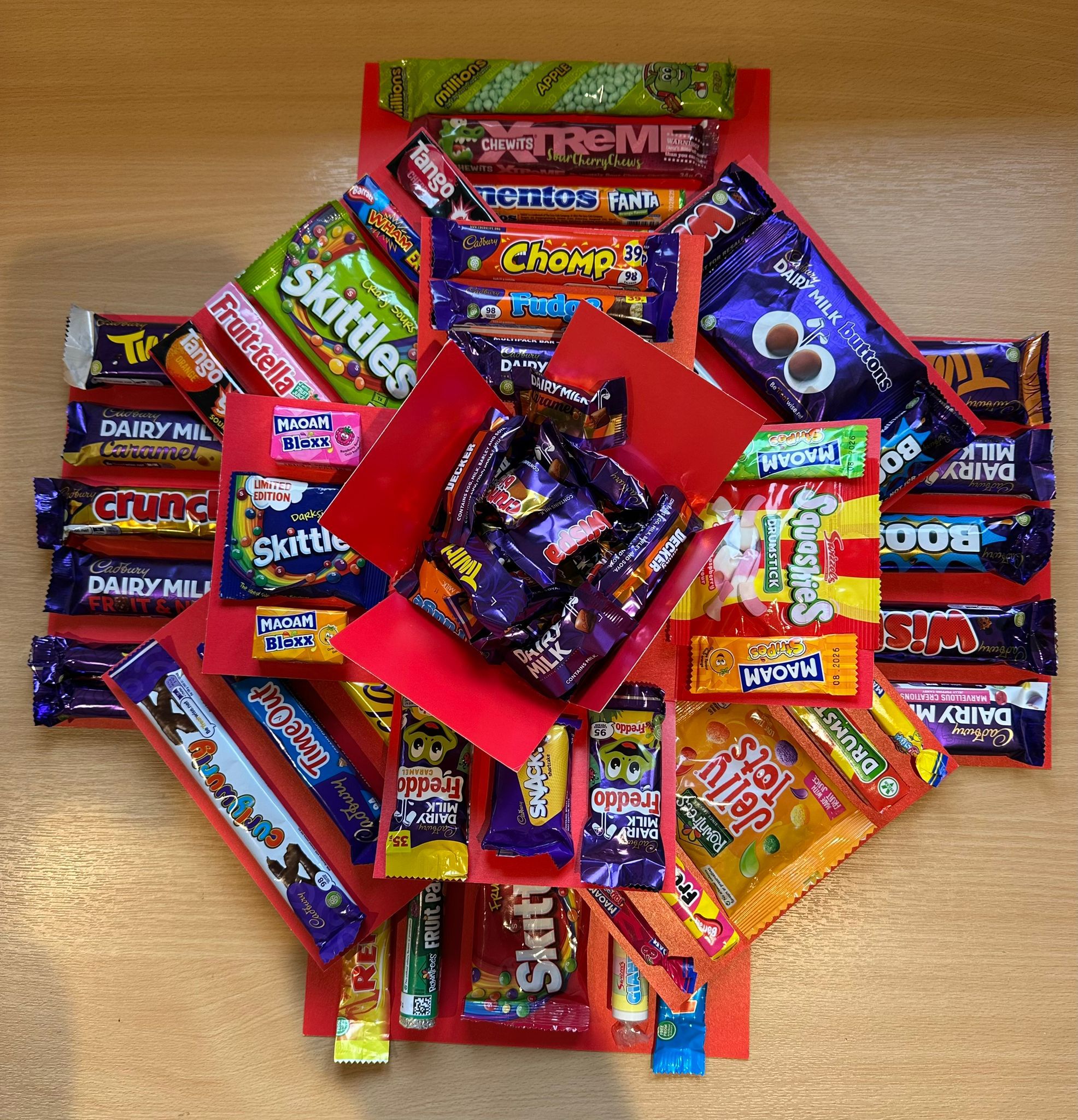 🎁 As you lift the lid, layers unfold to reveal a delicious explosion of everyone’s favourite chocolate bars and sweets — from Galaxy, Dairy Milk, Haribo, Millions and more! Each tier is carefully packed and beautifully presented for that magical “wow” moment.