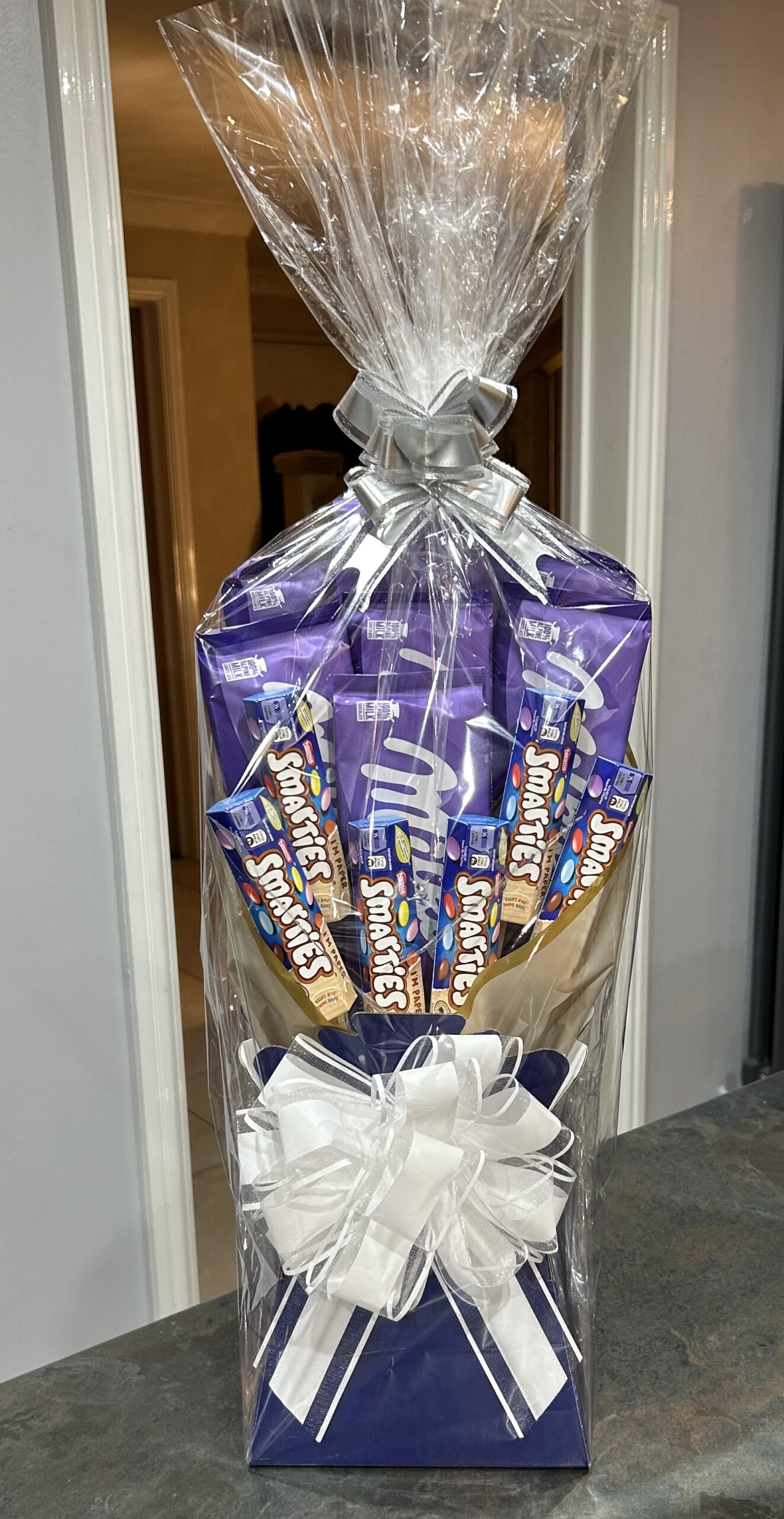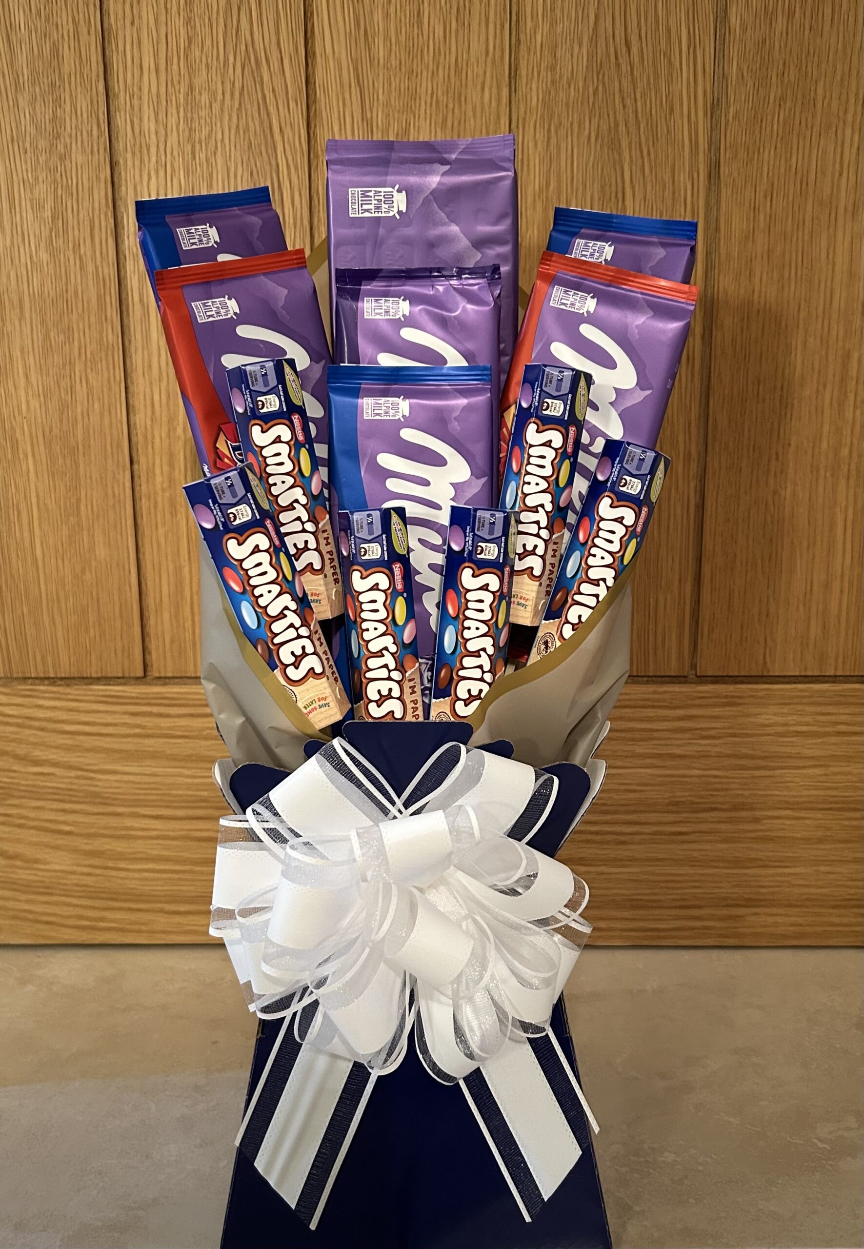 Beautifully arranged by hand, this eye-catching display features a generous selection of creamy Mixed Milka bars paired with colourful, crunchy Smarties. Styled in a Dark purple/navy presentation box and finished with an elegant white layered bow, it’s a show-stopping treat for birthdays, thank-yous, celebrations or simply to make someone smile.