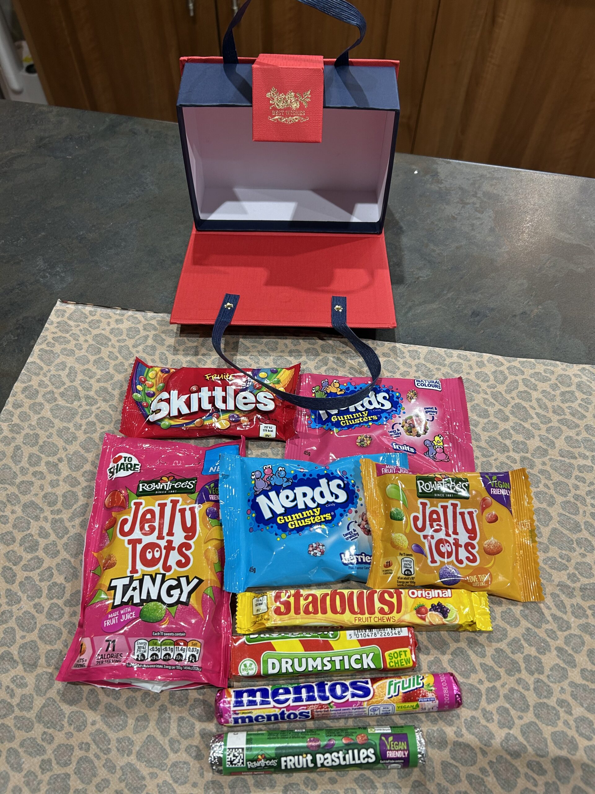 Beautifully presented in a premium navy & red gift handbag with ribbon handles, this treat box opens to reveal a rainbow of sweets, all neatly arranged for maximum WOW factor!